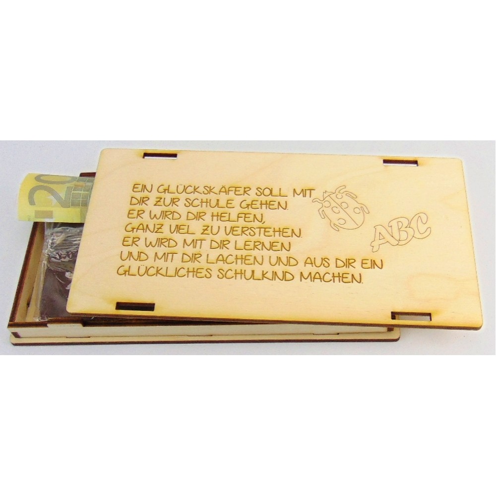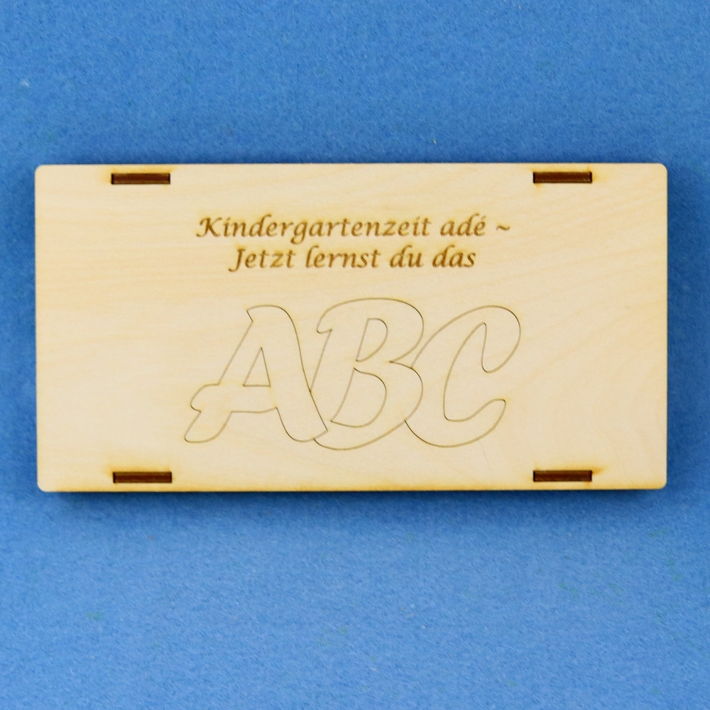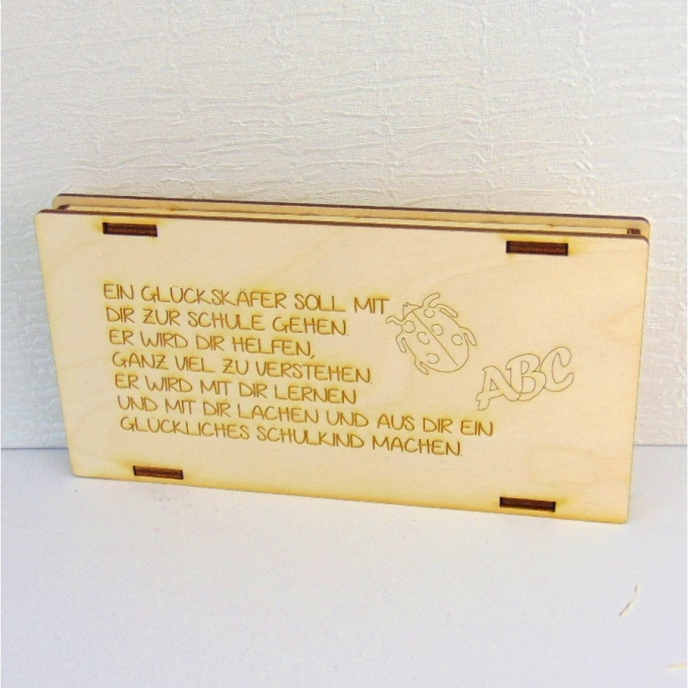 Diese liebevoll gefertigte Holzkiste ist die perfekte Verpackung für kleine Geschenke zum Schulanfang. Ob Schokolade, geldscheine, Gutschein - alles findet in dieser stabilen Box aus 3mm Birkenholz seinen Platz.