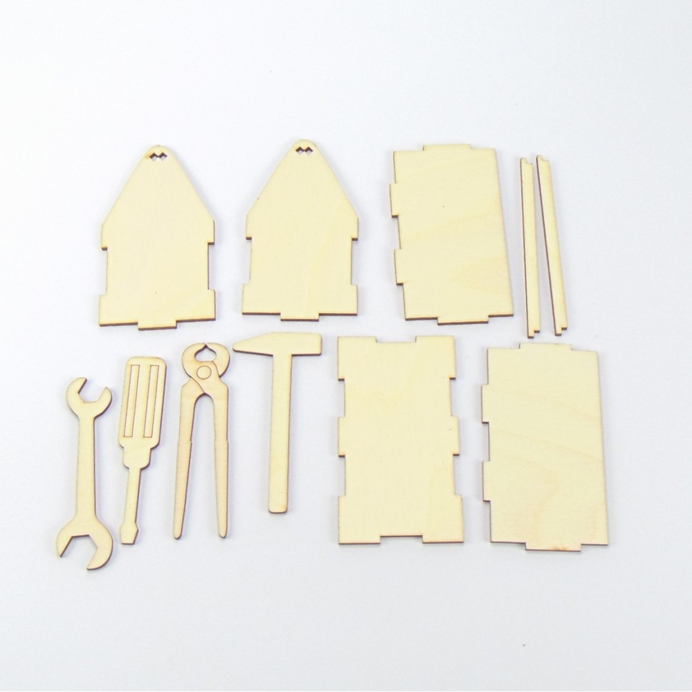 Das Set wird mit Holzwerkzeug geliefert. Dazu gehören Hammer, Schraubenschlüssel, Zange und Schraubenzieher.