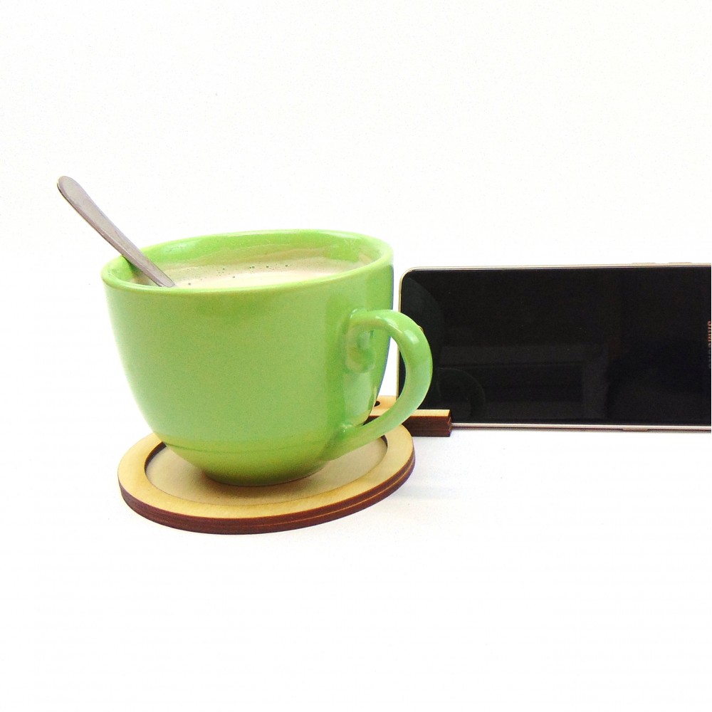 Kaffee Untersetzer aus Birken Sperrholz und einer Handy Halterung