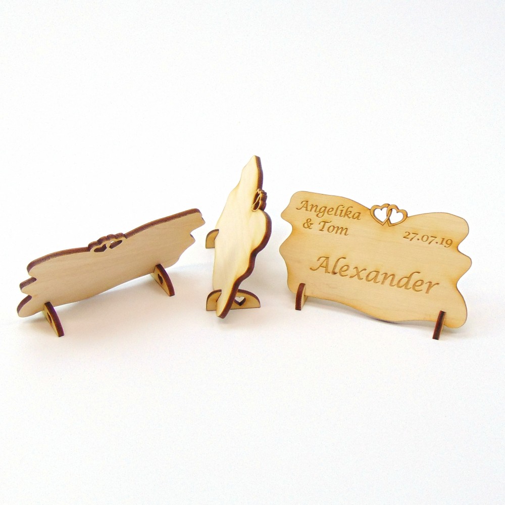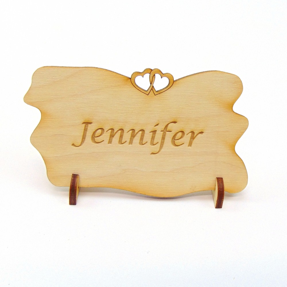 Tischkarten mit Doppelherz oben ohne Gravur, mit Namensgravur oder mit individueller Gravur.