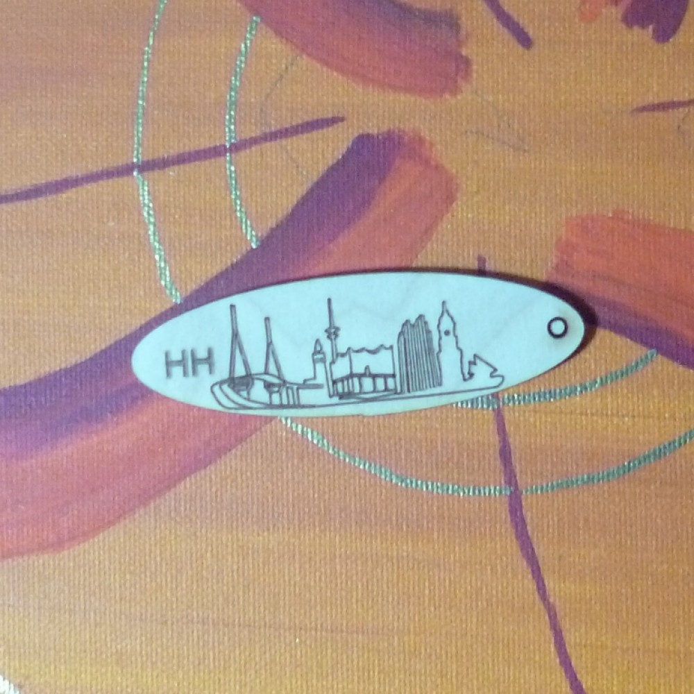 Schlüsselanhänger mit eingelaserter Skyline von Hamburg.