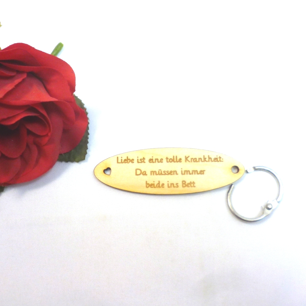 Schlüsselanhänger mit der Gravur "Liebe ist eine tolle Krankheit, da müssen immer beide ins Bett"