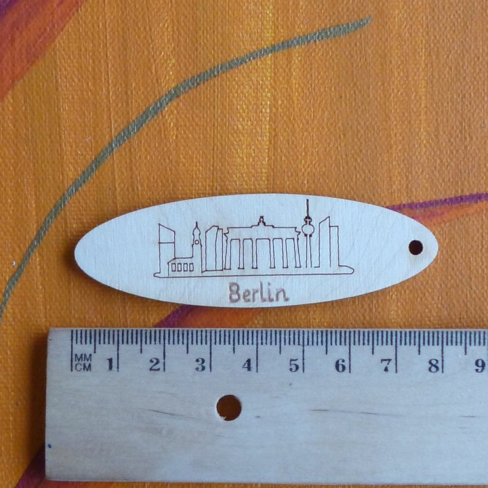 Schlüsselanhänger mit eingelaserter Skyline von Berlin.