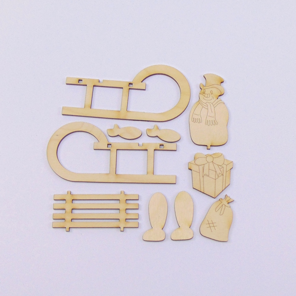 Im Set enthalten ist ein Schlitten (3 Teile), ein Schneemann (5 Teile), ein Geschenk und ein Sack.