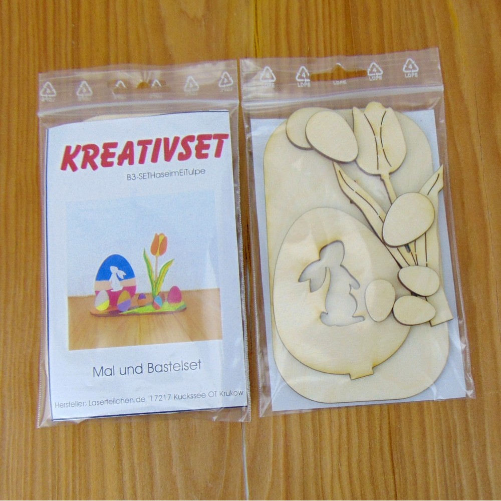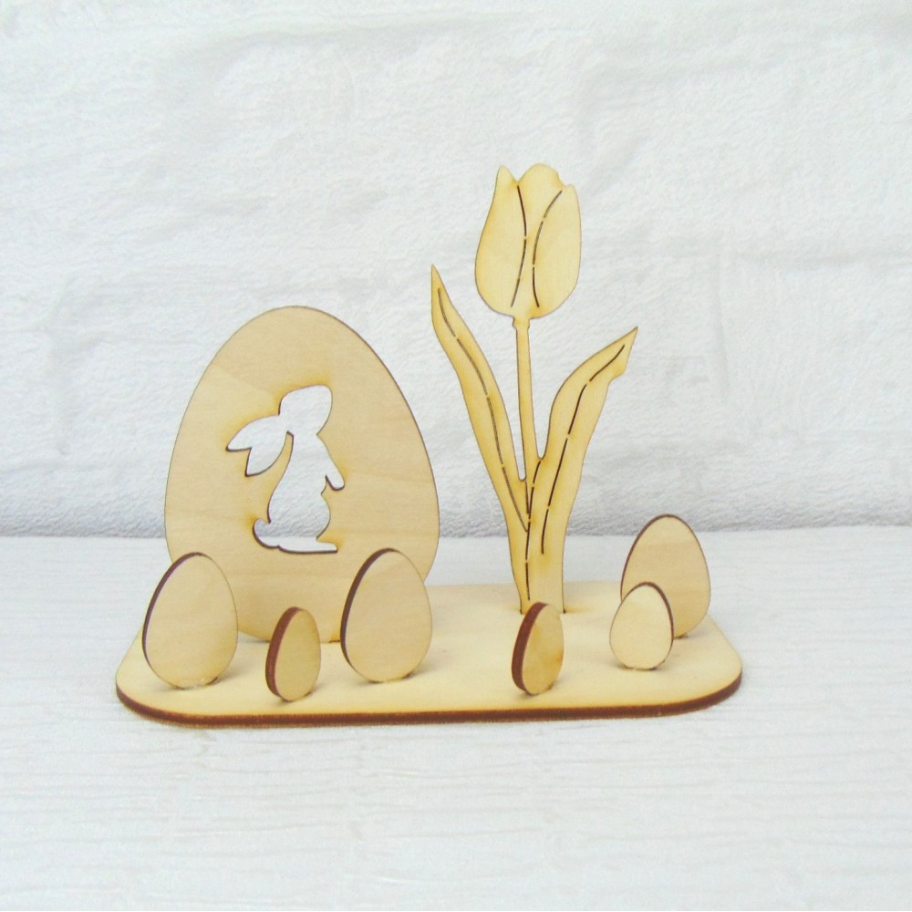 das ein süßer Hase gelasert wurde, 6 kleinen Eiern und einer großen Tulpe - die auf eine Bodenplatte geklebt werden können, damit das Ganze sicher steht.