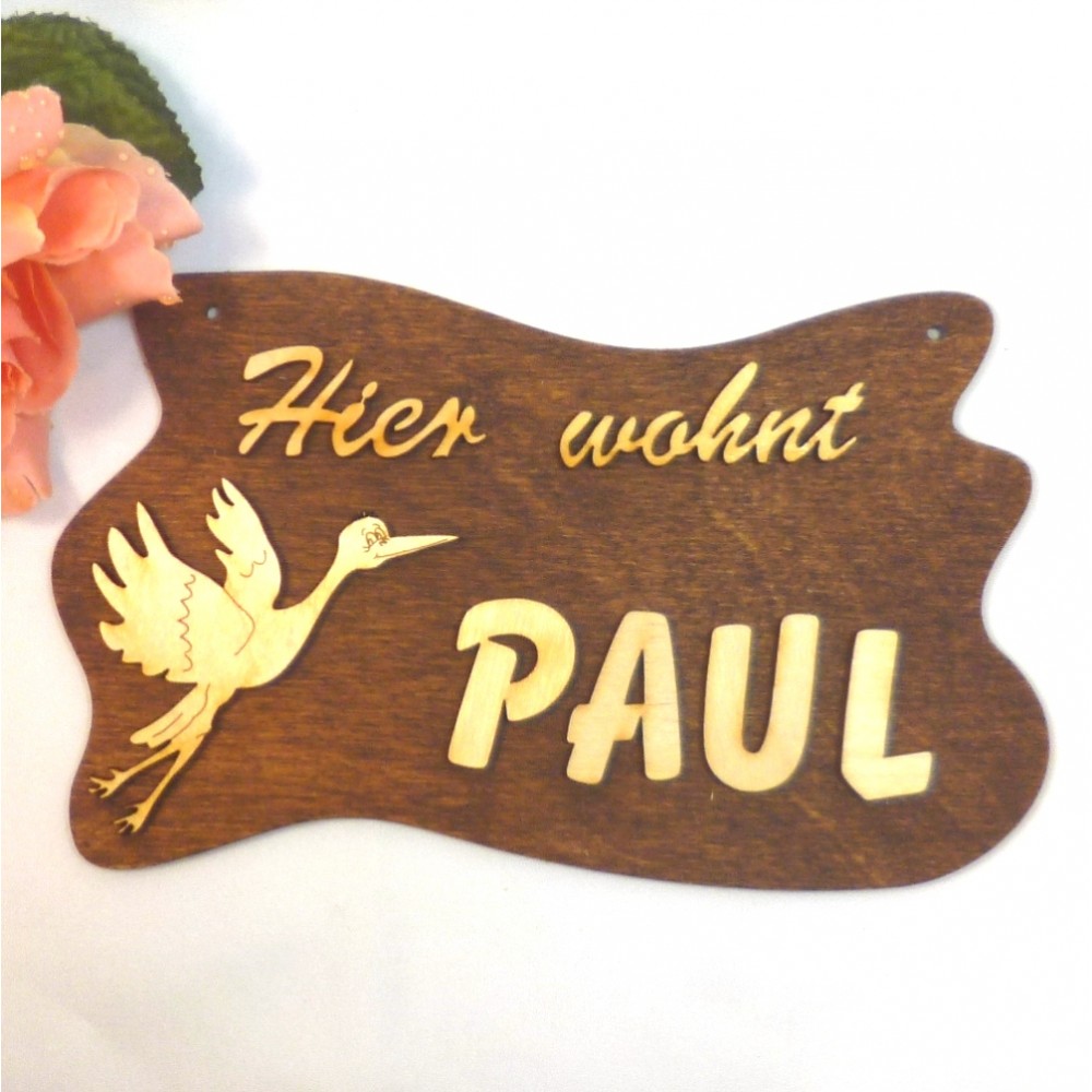 Sie bekommen den Schriftzug "Hier wohnt" .... (Ihr Name), auf braunem Untergrund, inklusive einem Storch.