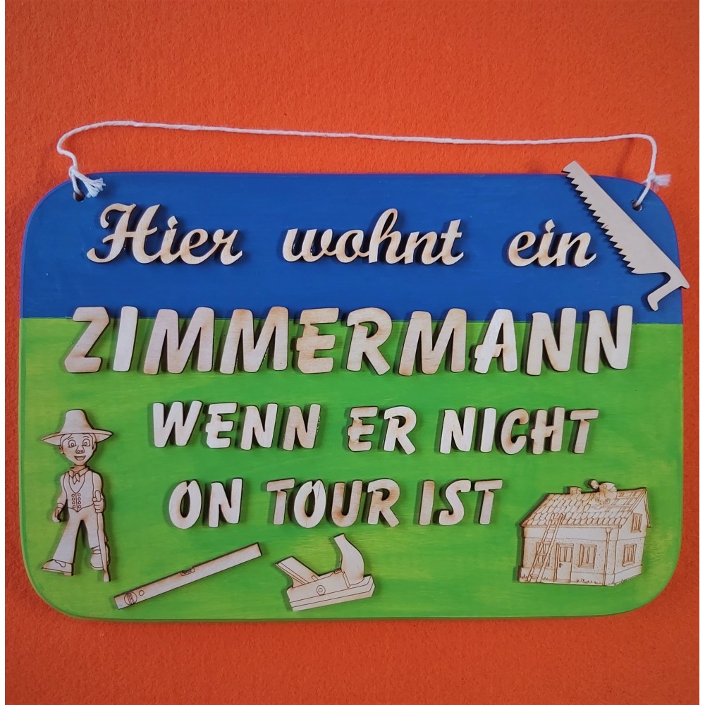 Holzbrett mit Spruch Hier wohnt ein Zimmermann wenn er nicht on Tour ist