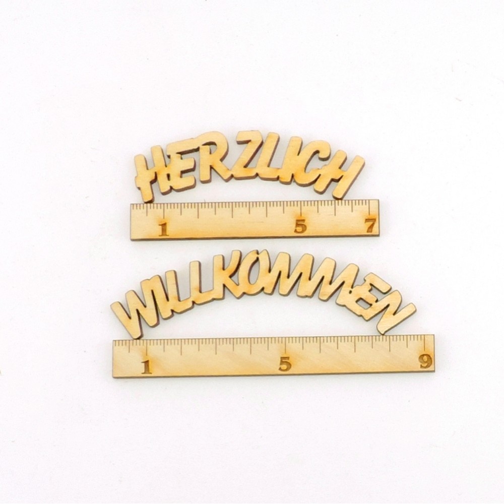 Schriftzug aus 3mm Birkenholz, Herzlich Länge 68mm, Willkommen Länge 90mm, aus zwei Teile.