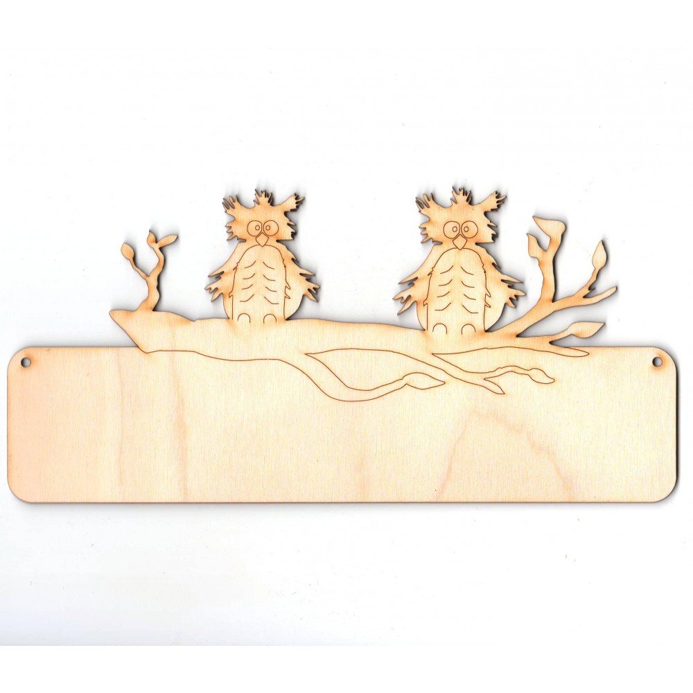 Türschild, Motiv 2 Wuscheleulen auf einem Ast aus 3mm Sperrholz, Länge 235 mm, Höhe 110 mm, unbemalt mit 2 Löcher zum Anhängen.