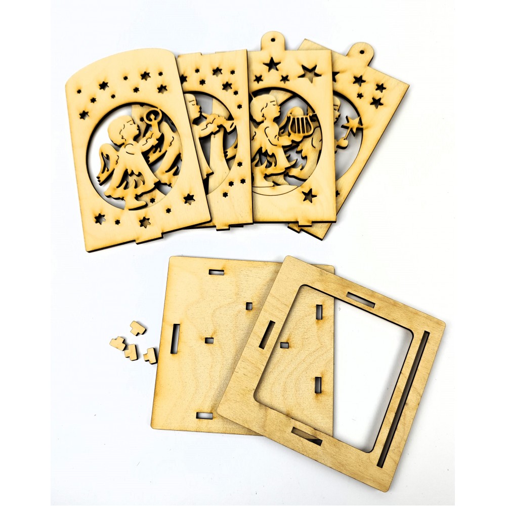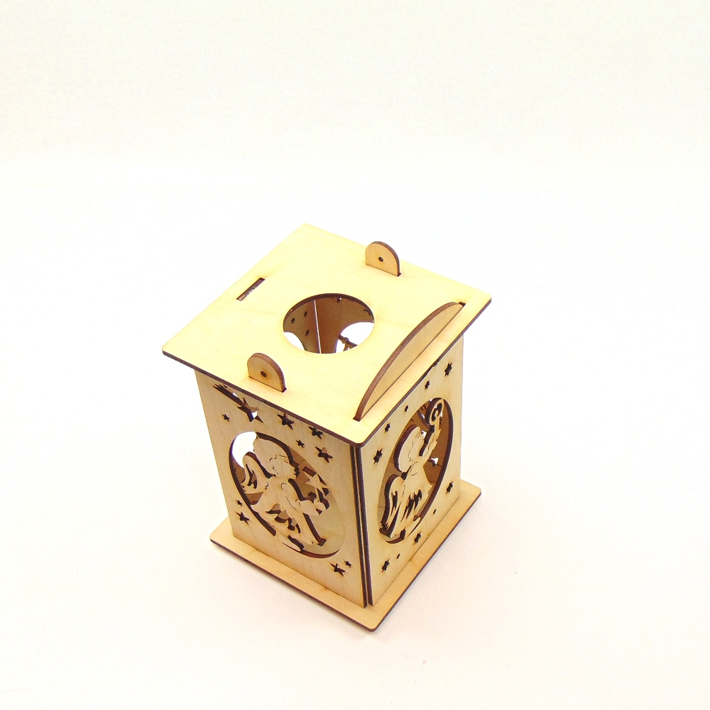 Sie besteht aus Boden, Deckel, 4 Seitenteilen und 4 Teelichthaltern.