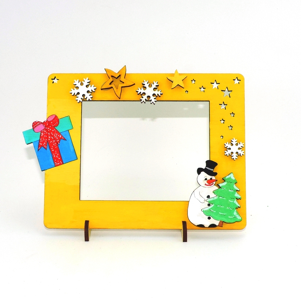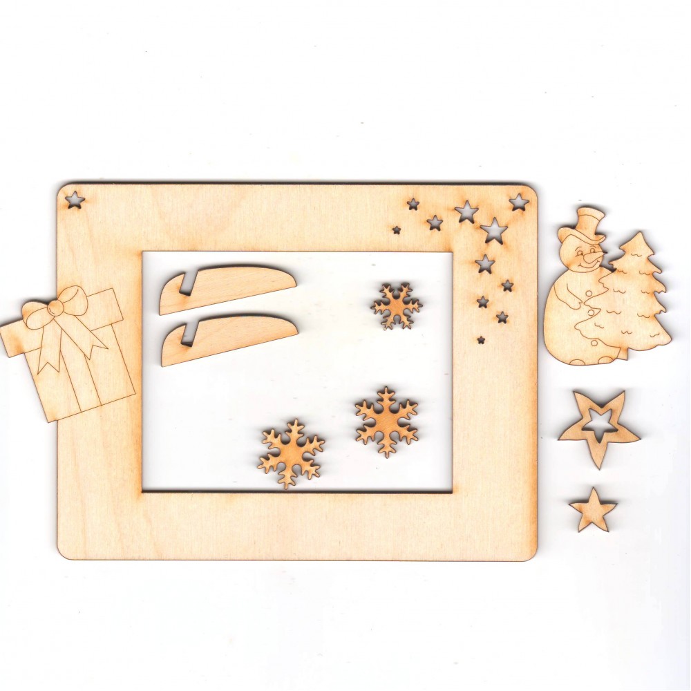 Im Set enthalten ist ein Bilderrahmen, ein Schneemann, 2 Sterne und 3 Schneeflocken, inklusive Füße zum Hinstellen.