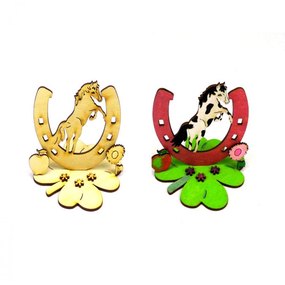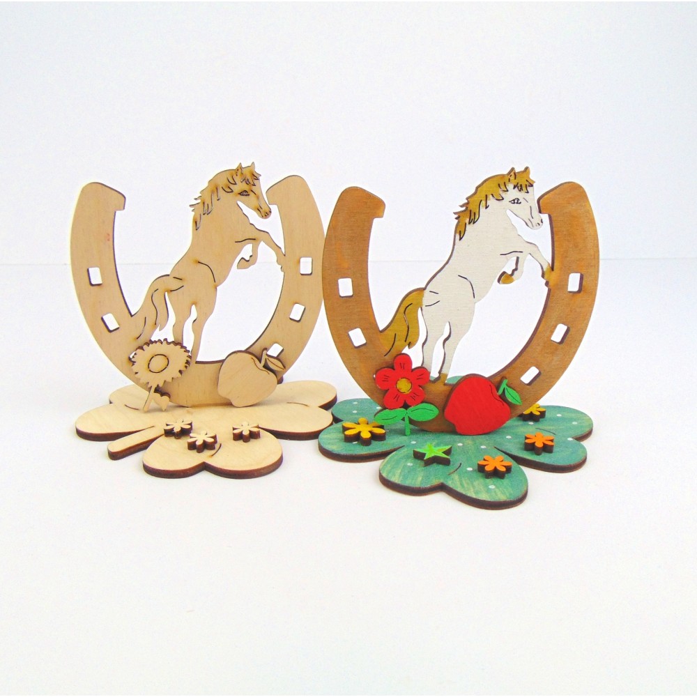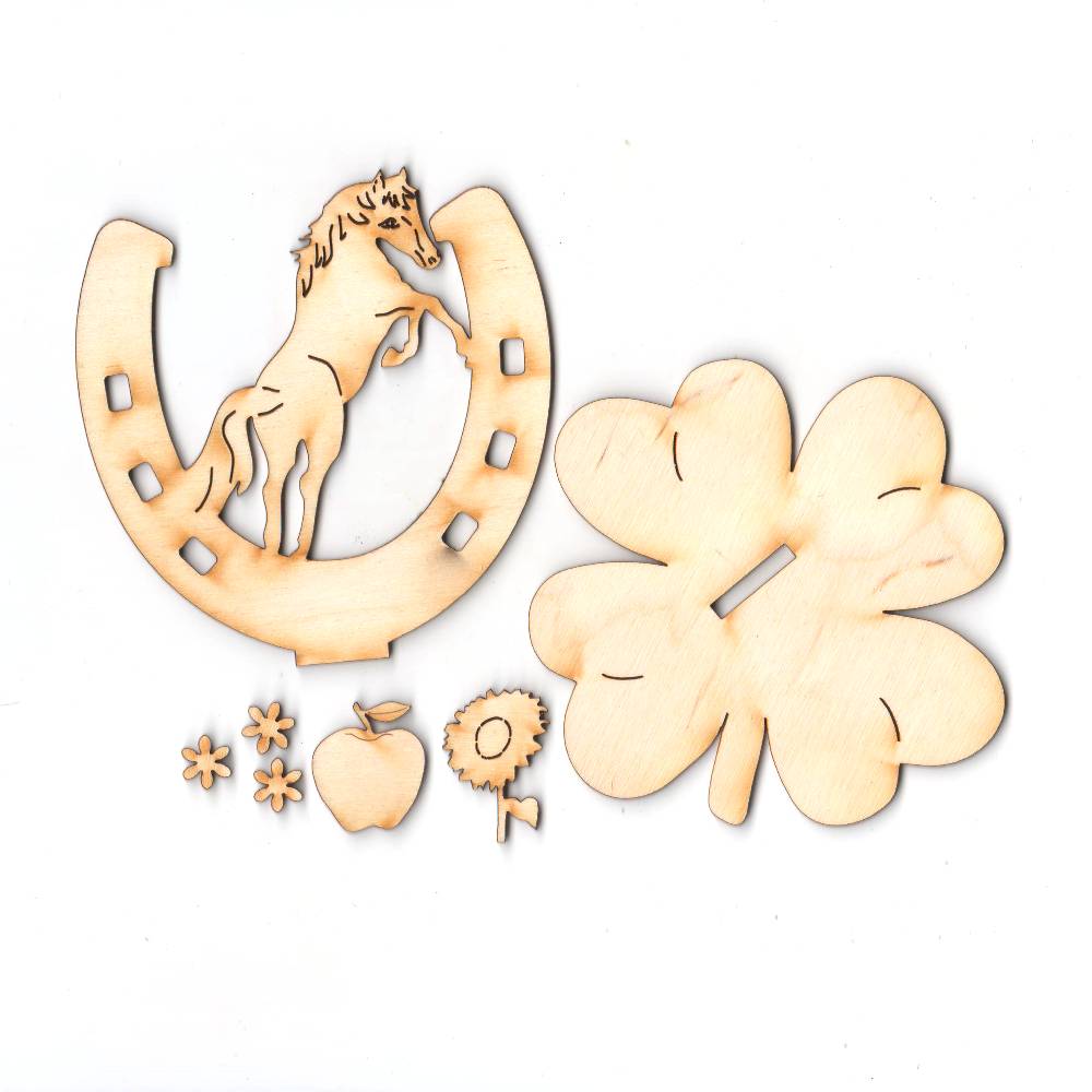 Das Bastelset besteht aus einem Springendem Pferd im Hufeisen, Apfel und Blumen sowie einer Unterplatte als Kleeblett zum Hinstellen.
