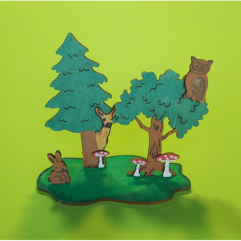 Das Bastelset besteht aus einem Baum, einer Tanne mit Reh, einem Hasen, einer Eule, Pilzen sowie einer Unterplatte zum Hinstellen.