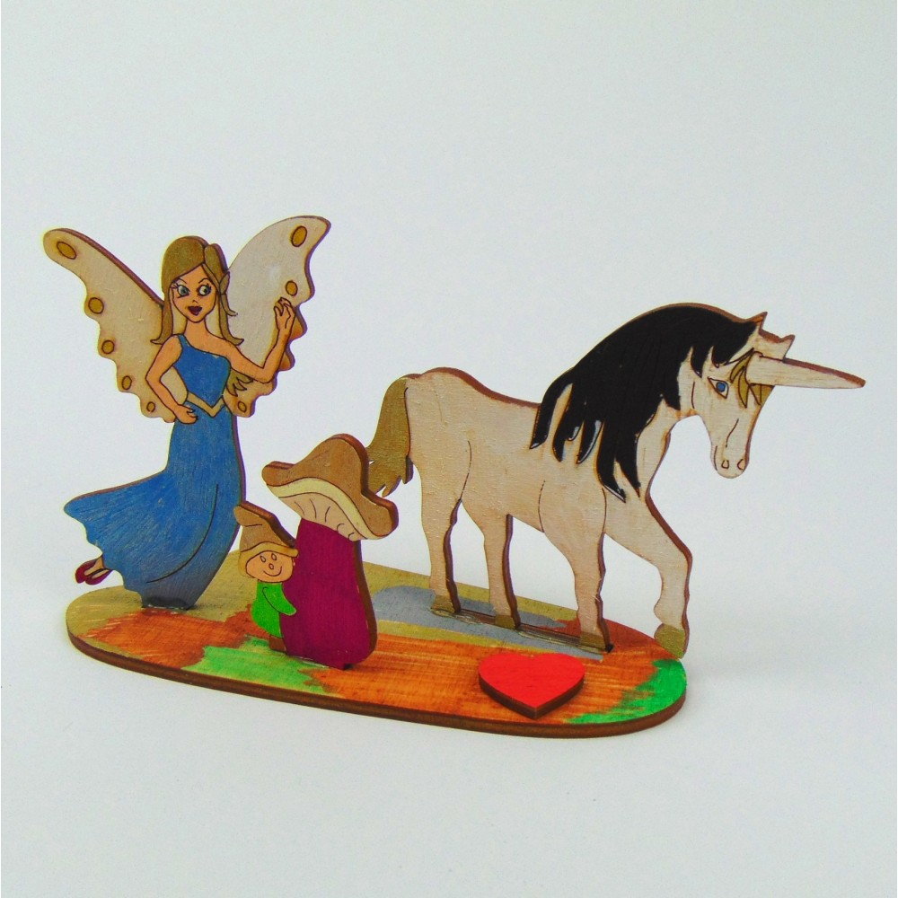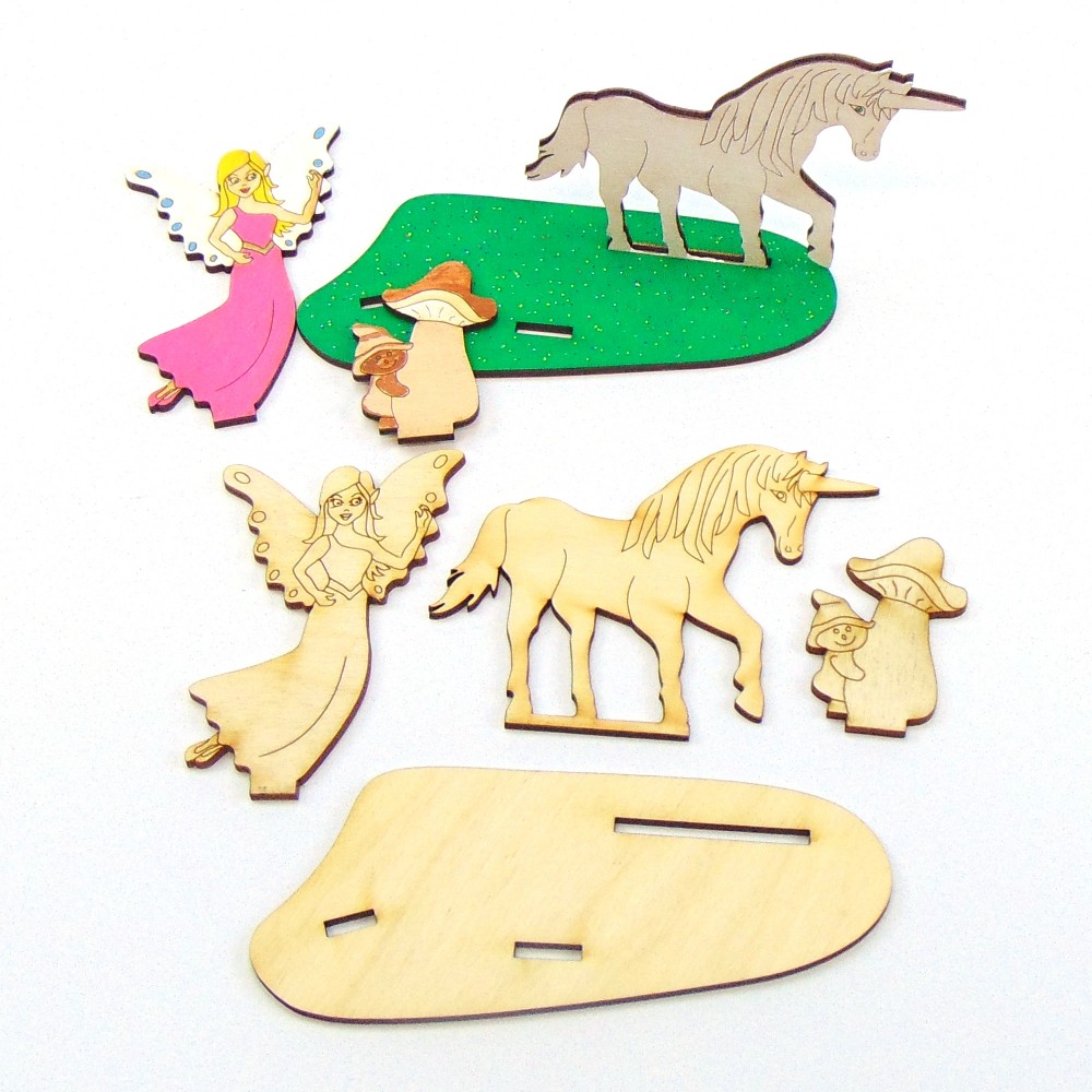 Dieses zauberhafte Bastelset besteht aus einer Fee, dem Einhorn, einem Zwerg am Pilz sowie einer Unterplatte zum Hinstellen.