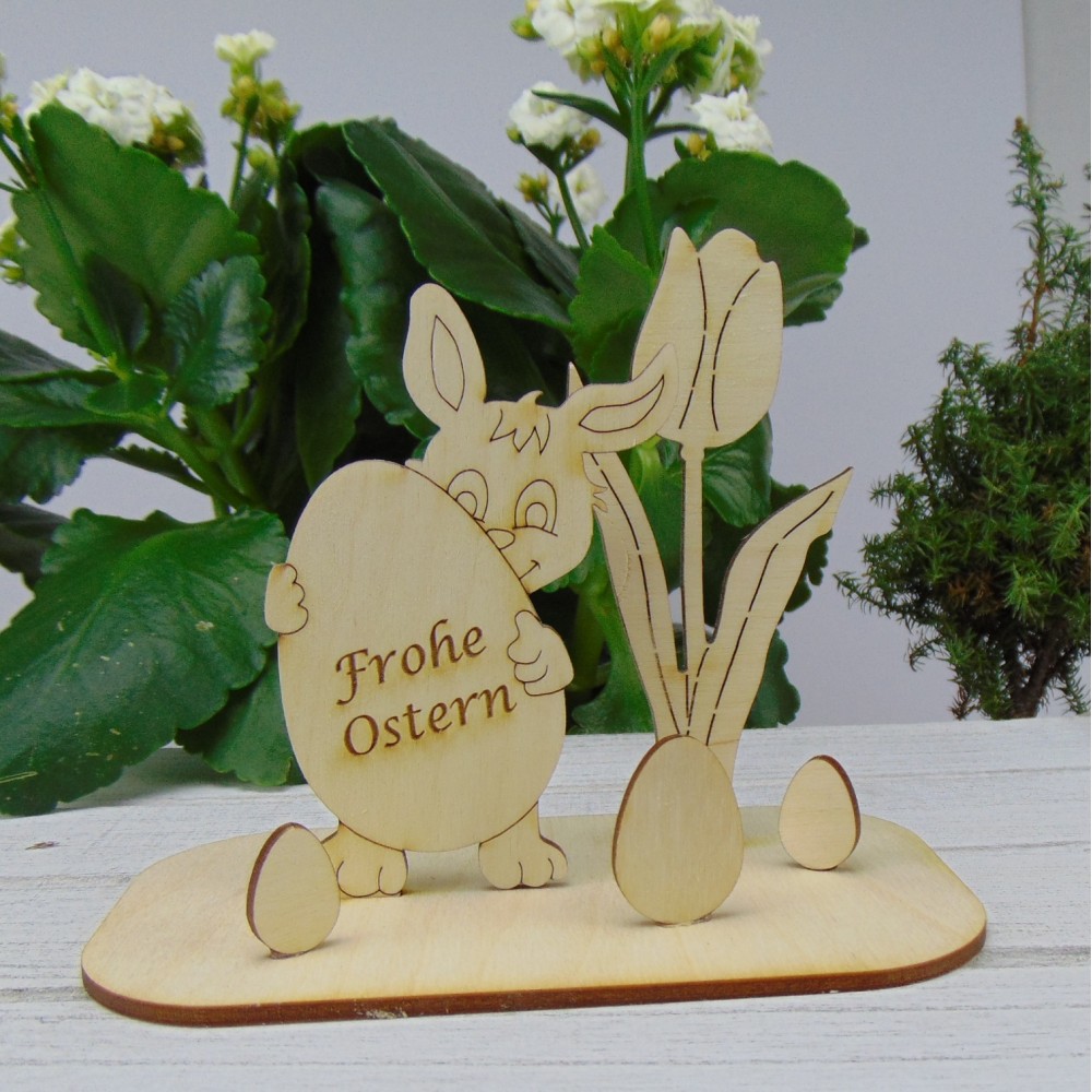 Hase hält Ei mit Blume und drei kleinen Eiern, sowie Unterplatte zum hinstellen.