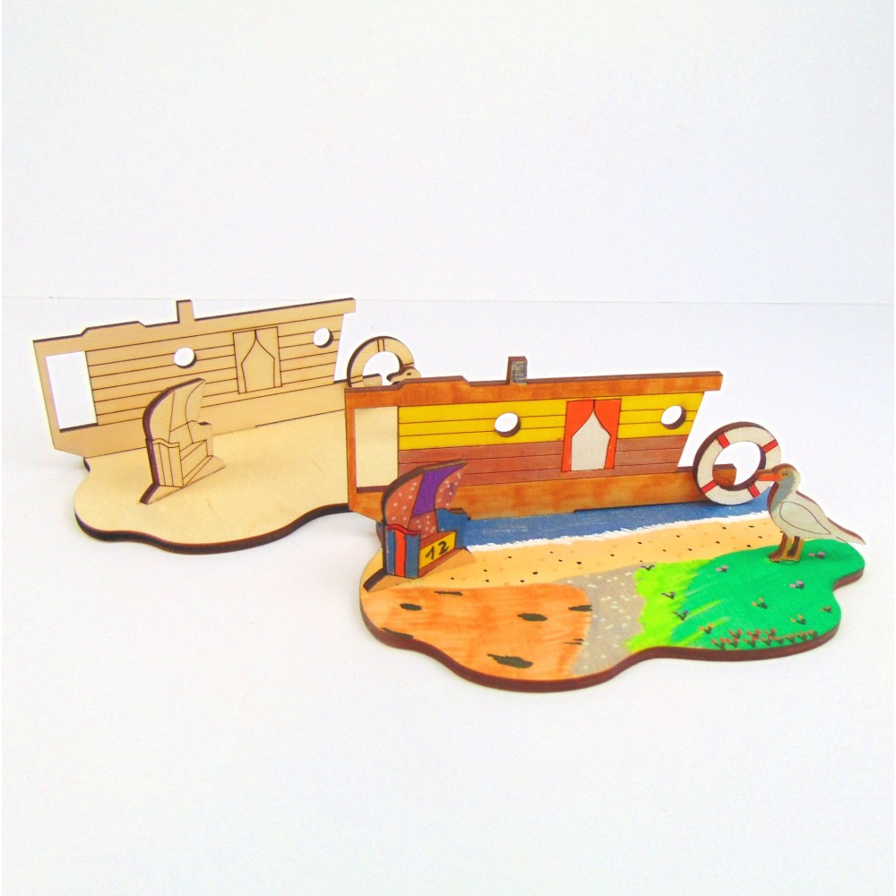 Das Bastelset besteht aus einer Unterplatte zum Hinstellen und einem Hausboot, Anker, Strandkorb
