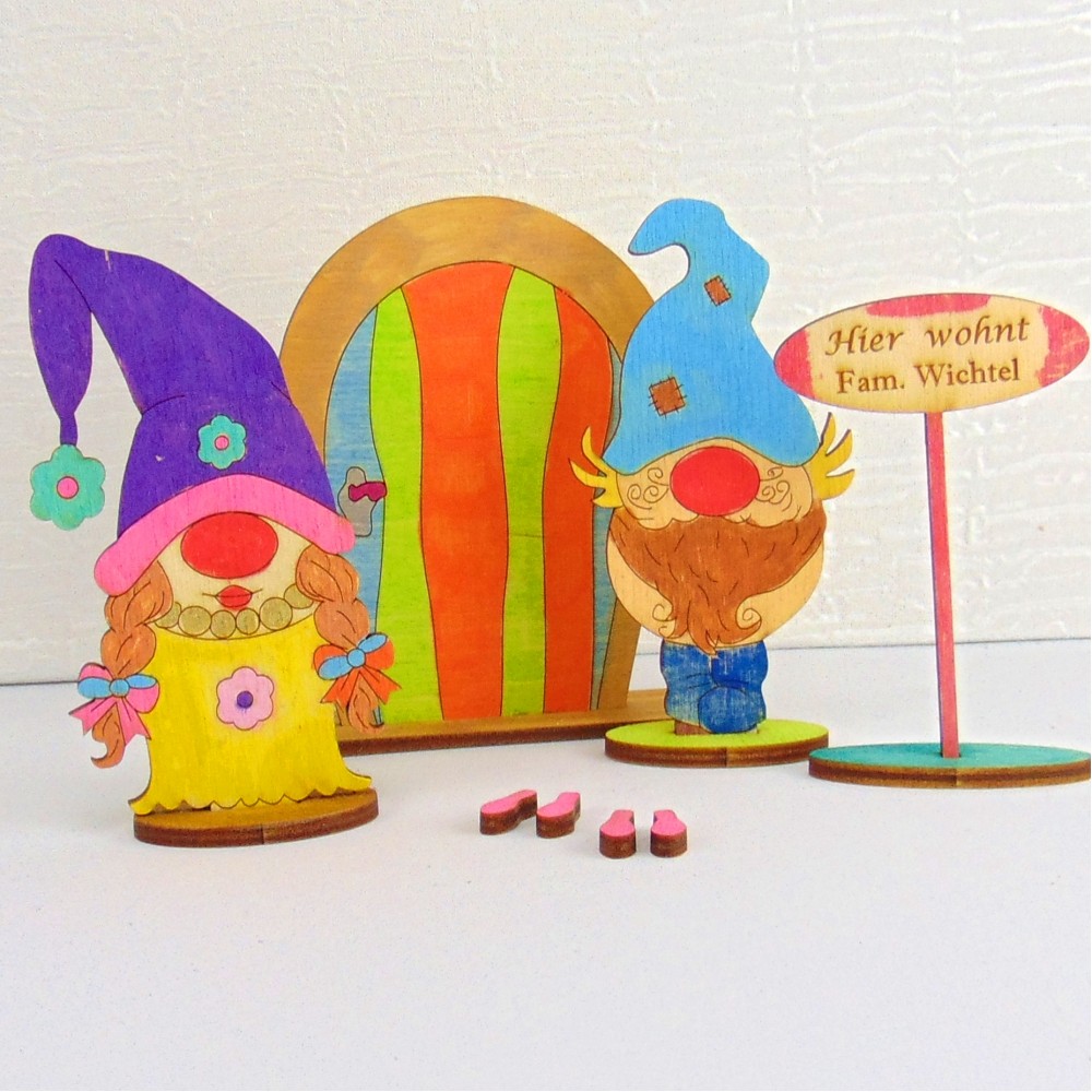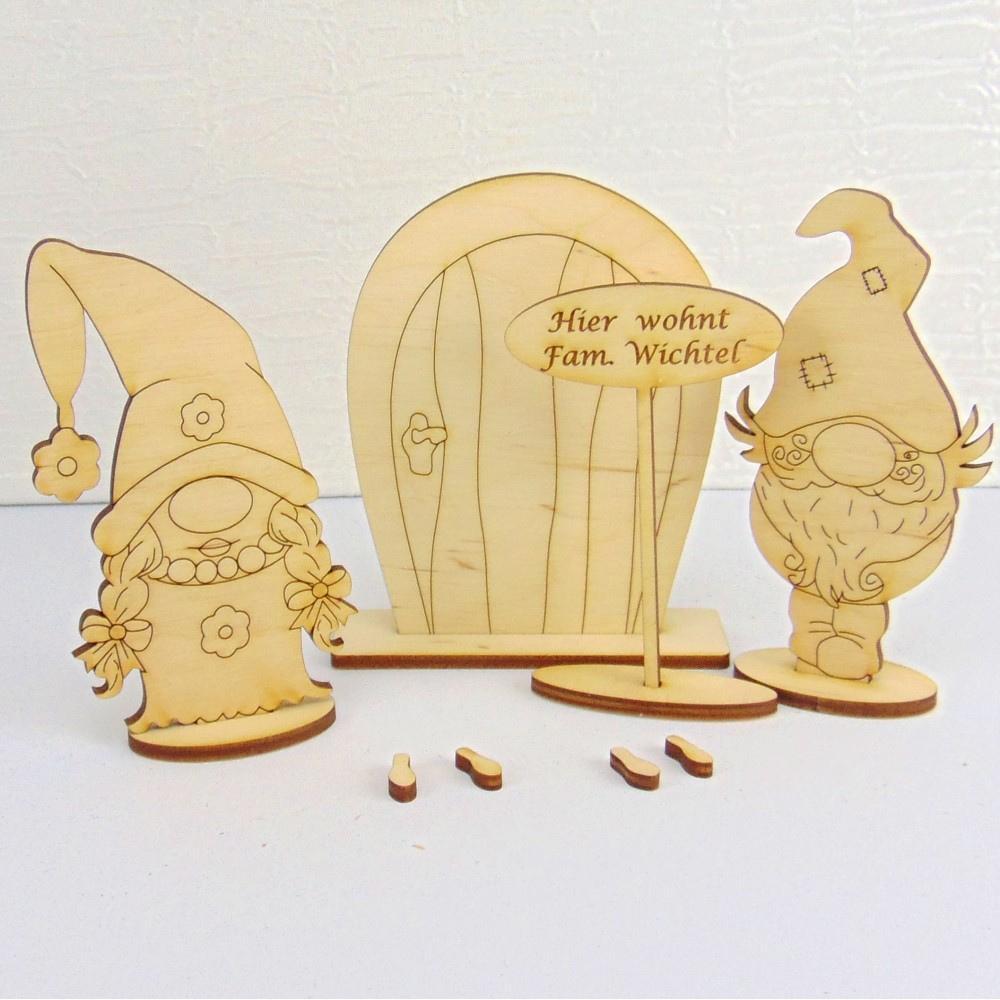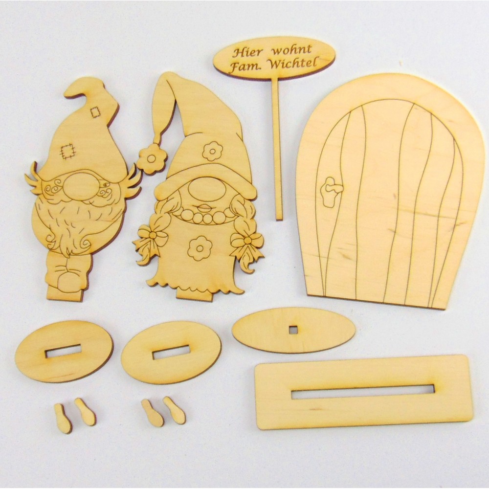 Ein niedlicher Wichtel mit seiner Frau bringen ihre Wichteltüre, ihr Namensschild und ein paar Spuren gleich mit und warten darauf, bemalt und zusammengebaut zu werden.