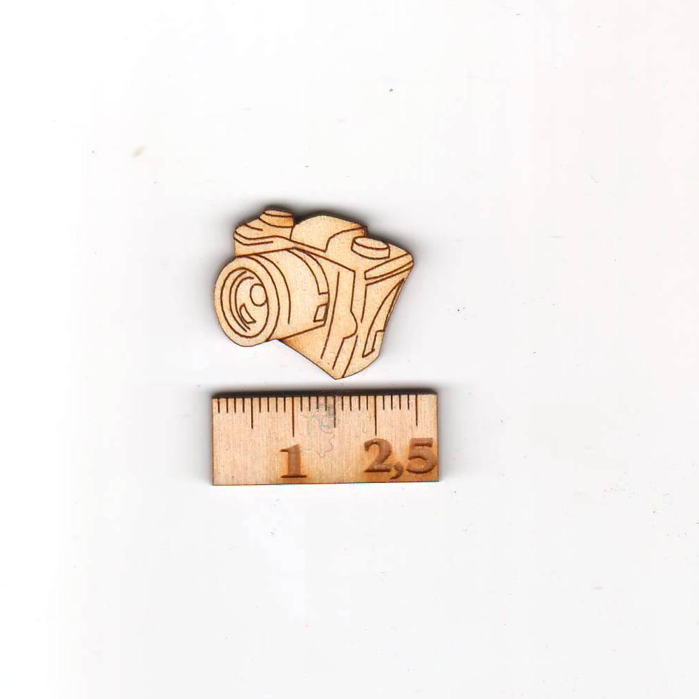 Die Fotokamera aus heimischem 3 mm stabilem Birkenholz hat eine Höhe von 20 mm und Breite von 25 mm. Die Musterung ist einseitig. Sie können es für Fotoalben oder zum Karten Dekorieren nutzen.