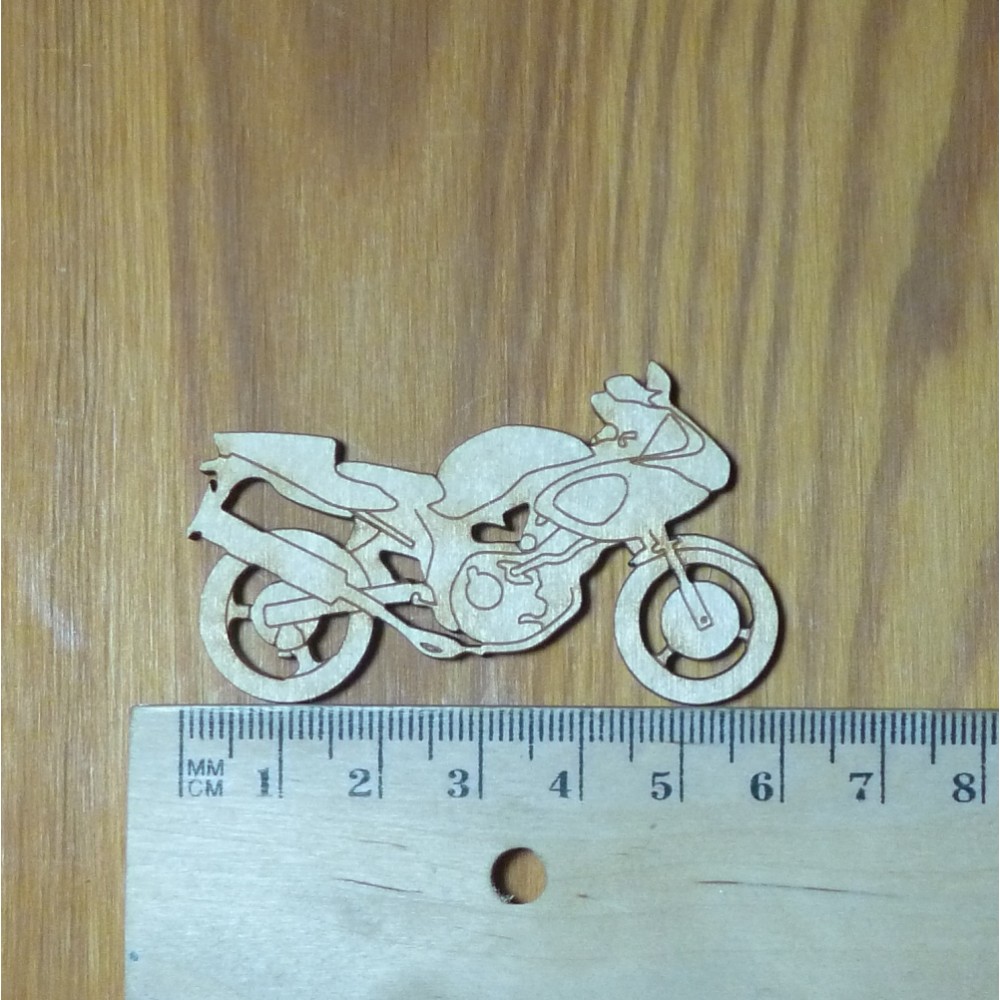 Motorrad aus 3 mm dickem Birkenholz, Höhe 35 mm, Breite 60 mm.