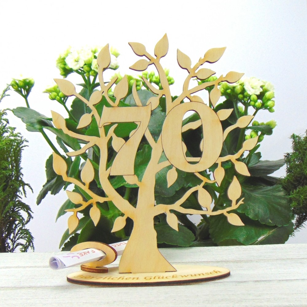 Geldgeschenk Lebensbaum mit Zahl 70 Gutschein oder Geld,Naturholz