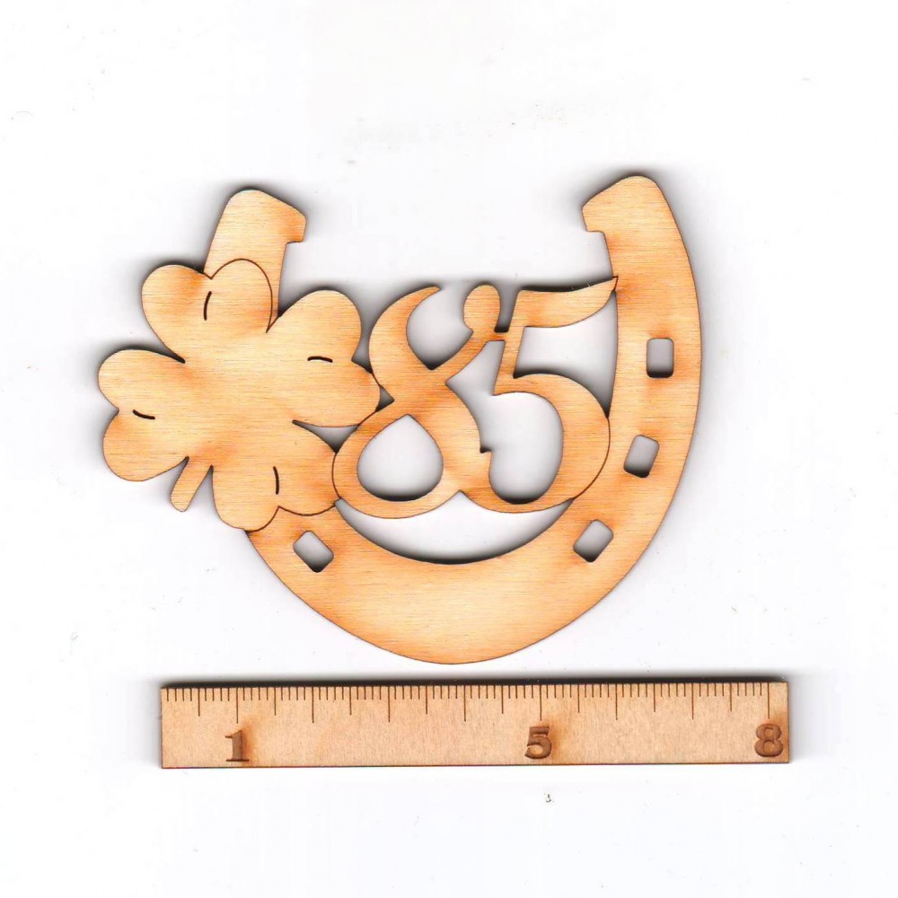 Das Hufeisen mit der Zahl 85 besteht aus 3 mm Birkenholz. Die Höhe beträgt 15 cm und die Breite 14 c..