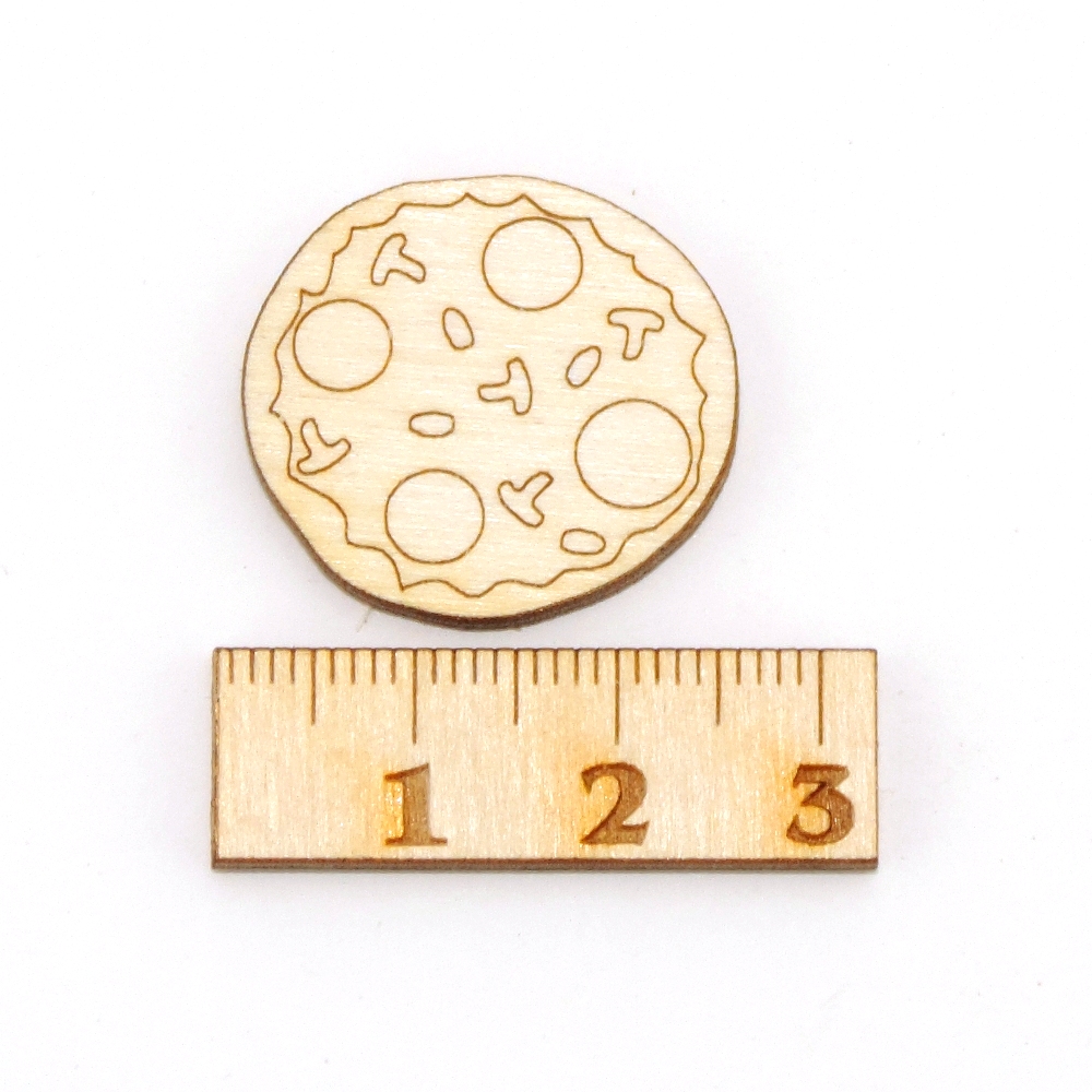 Pizza mit Belag aus 3 mm dickem Birkenholz, Höhe 25 mm, Breite 25 mm.