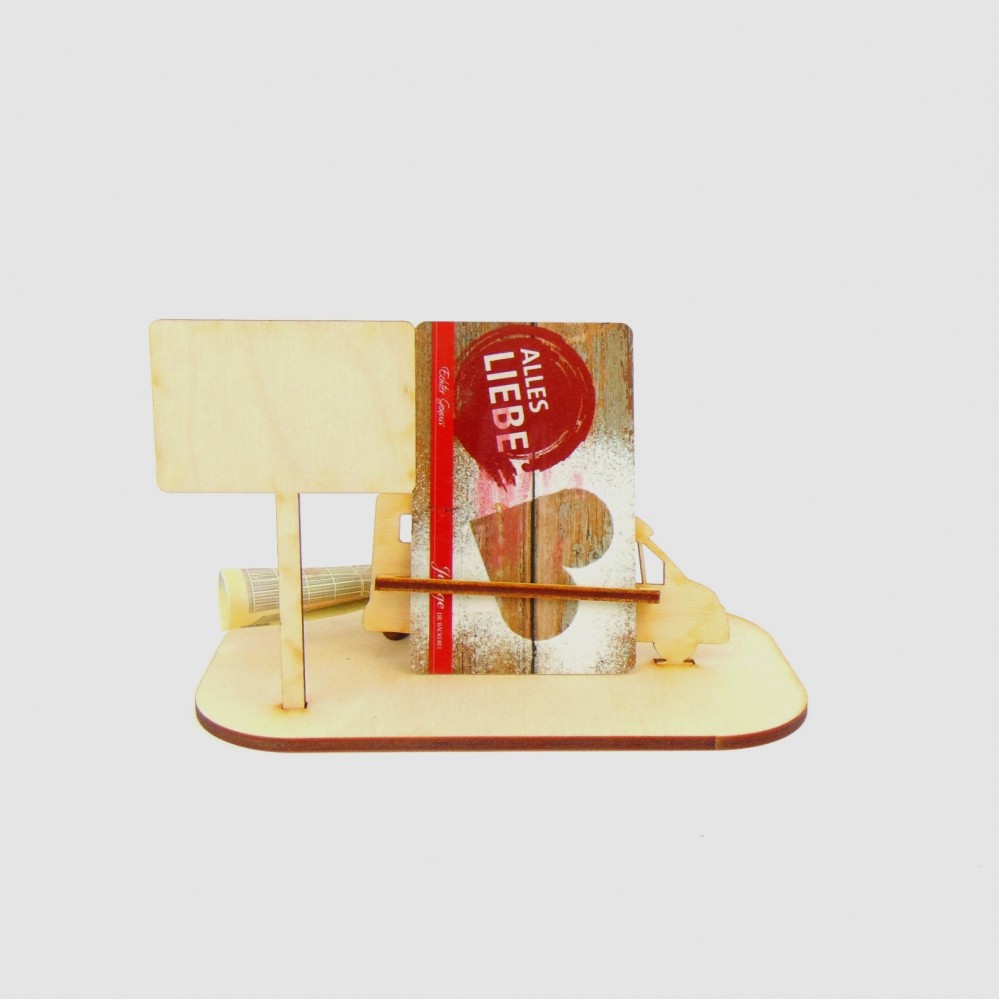 Schubkarre mit Ortsschild und Geldscheinhalter für Gartenliebhaber