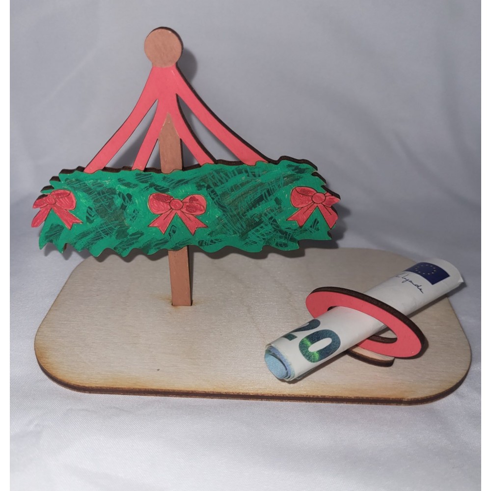 Das Mitbringsel besteht aus der Grundplatte 14 cm x 8 cm, einer Richtkrone 10 cm x 9 cm und einem Schild 5,5 cm breit und 10 cm hoch. Auf dem Schild gravieren wir gern einen Text Ihrer Wahl. Einen Geldscheinhalter ist in der Lieferung ebenfalls erhalten.