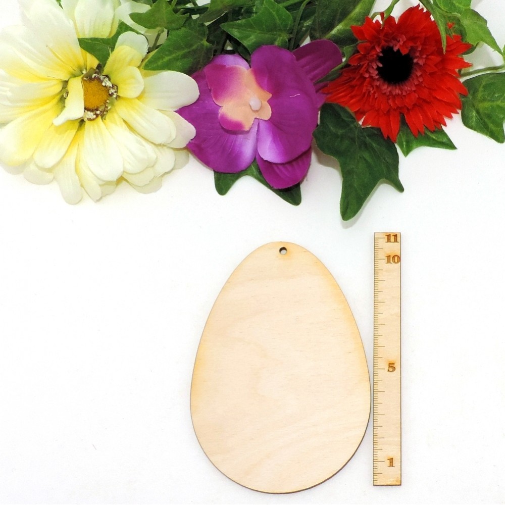 Das eine Deko EI ist aus 3 mm Birkenspeerholz, 100 mm Höhe, 76 mm Breit und einem Loch.