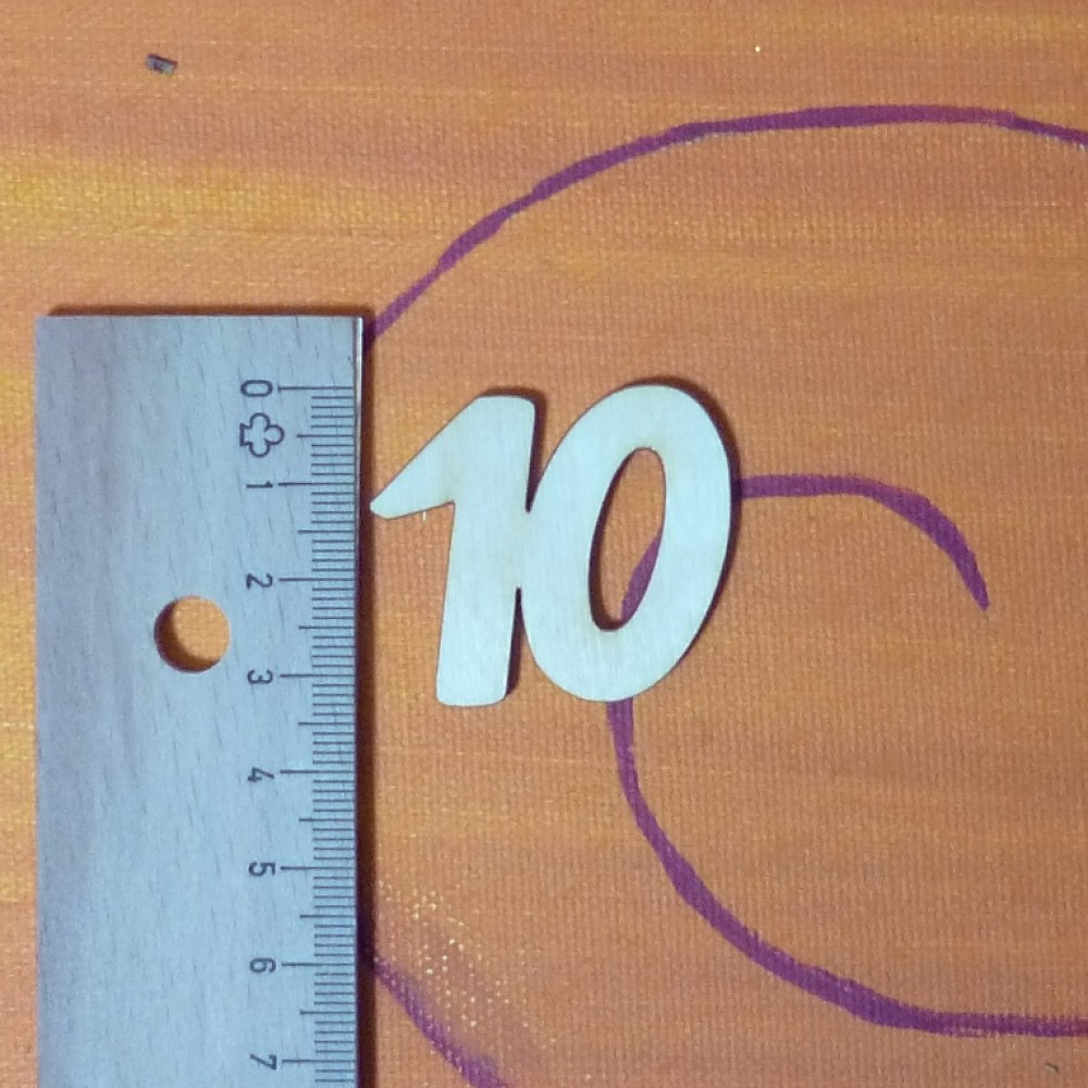 Die Tischnummer "10" ist aus 3 mm dickem Birkenholz einer Höhe von 170mm und einer Breite von 138m..