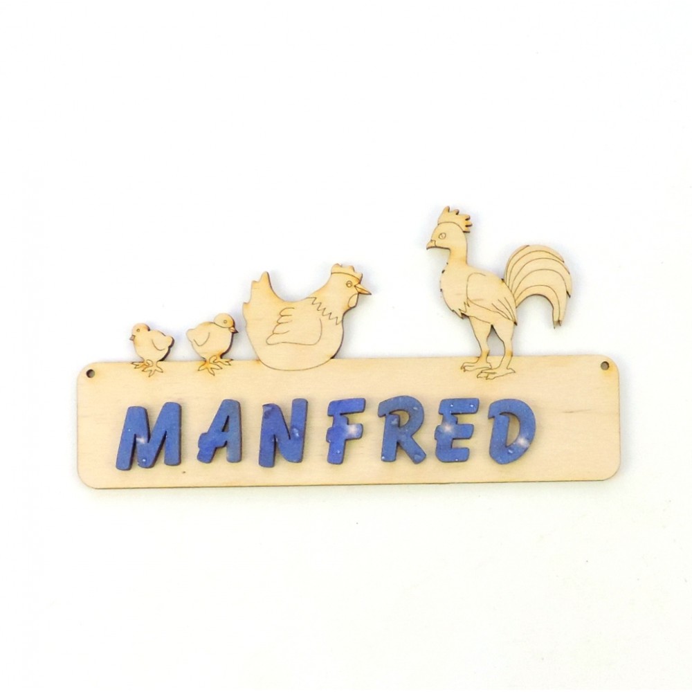 Türschild mit einem Hahn, einer Henne und Küken, 18 cm lang, 9,2 cm hoch, unbemalt, inklusive 2