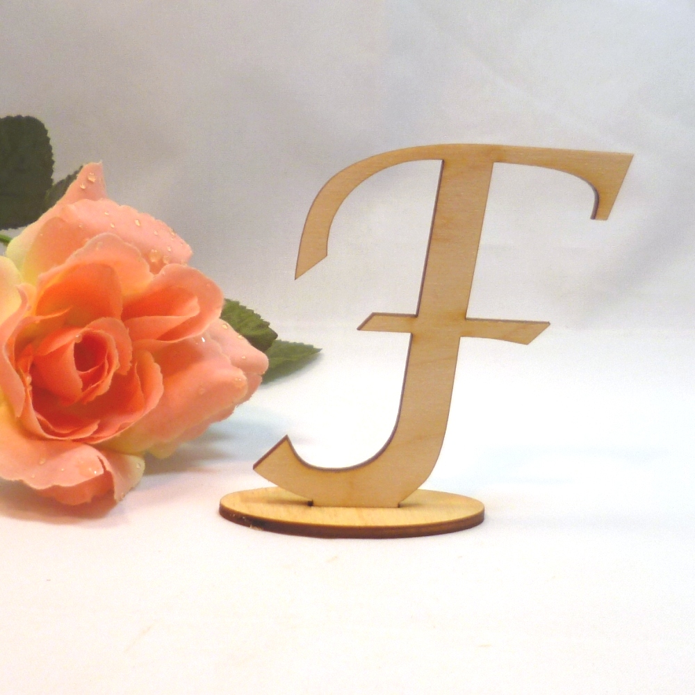 Der Hochzeits Buchstabe F hat eine ovale Platte als Fuß.