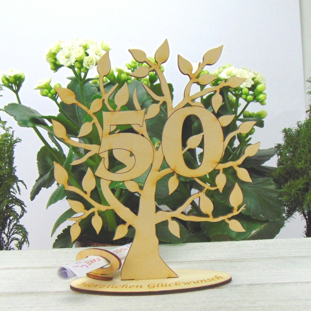 Geldgeschenk Lebensbaum mit Zahl 50 aus Naturholz