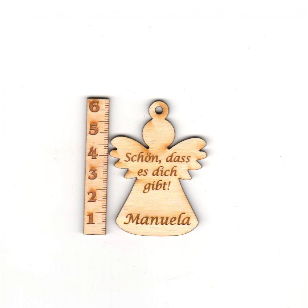 Einfacher schöner Engel aus 3 mm Birkenholz, Höhe 60 mm, Breite 48 mm, mit der Aufschrift.