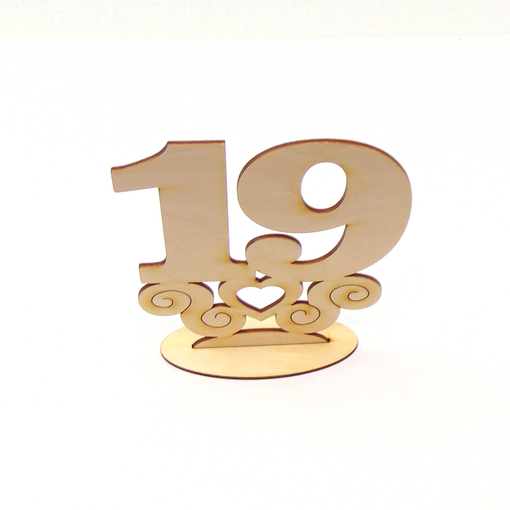 Die Tischnummer "19" ist aus 3 mm dickem Birkenholz einer Höhe von 170mm und einer Breite von 138mm