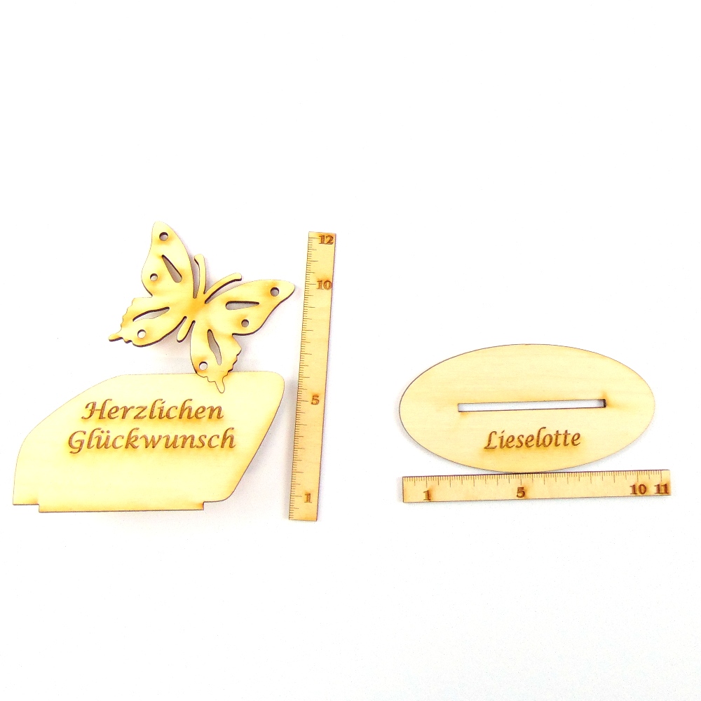 1 Aufsteller mit Schmetterling und Name des Geburtstagskindes Geldscheinhalter