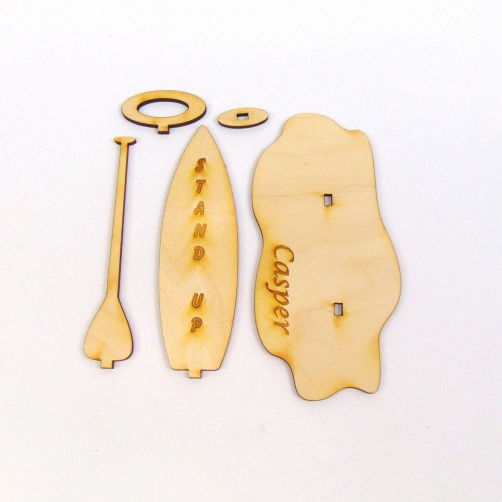 Bestehend aus der Grundplatte in der Größe 12,5 cm x 6 cm, einem Paddel in der Höhe 10 cm sowie dem Brett, welches 11 cm hoch ist und dem