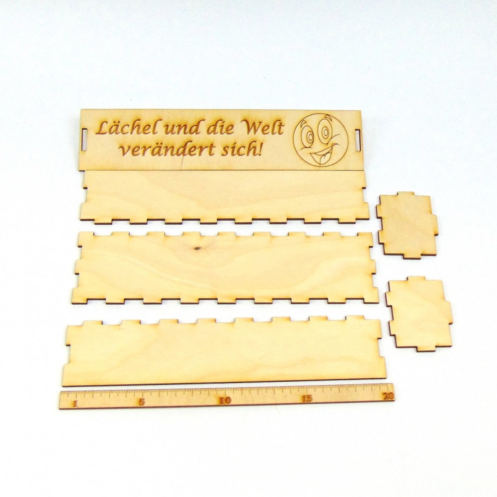 Die Box wird in Einzelteilen geliefert. Kinderleichter Zusammenbau mit etwas Holzleim zusammen kleben.