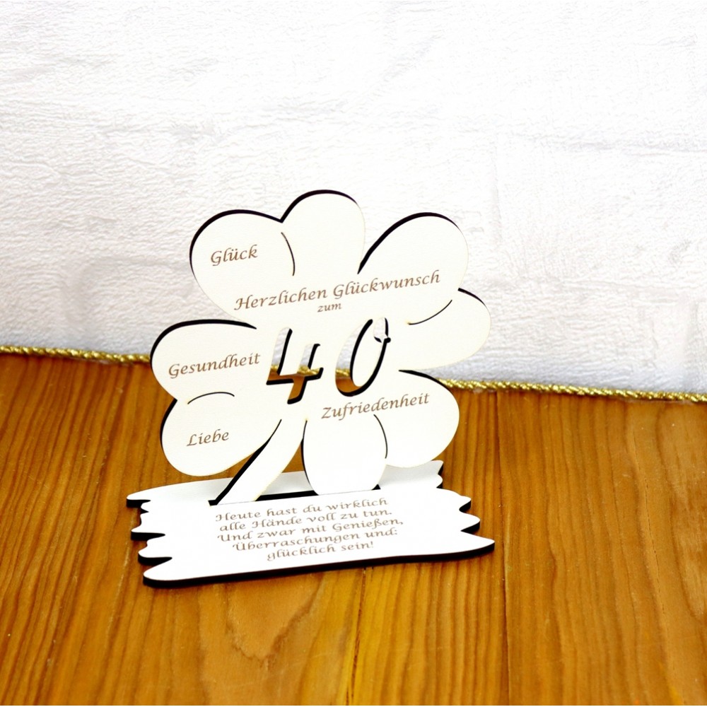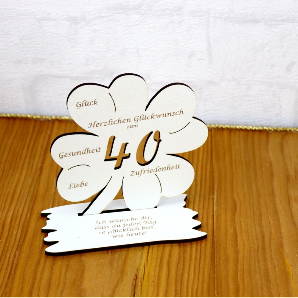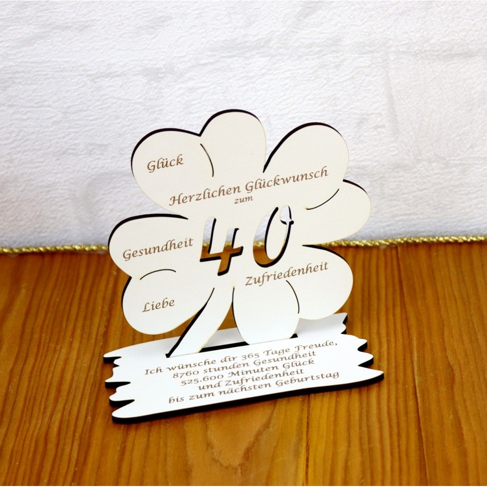 40. Geburtstag Geld-Gutschein-Geschenk - Kleeblatt weiß mit Gravur "Ich wünsche ... "