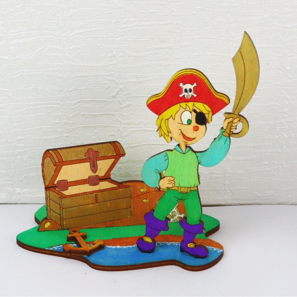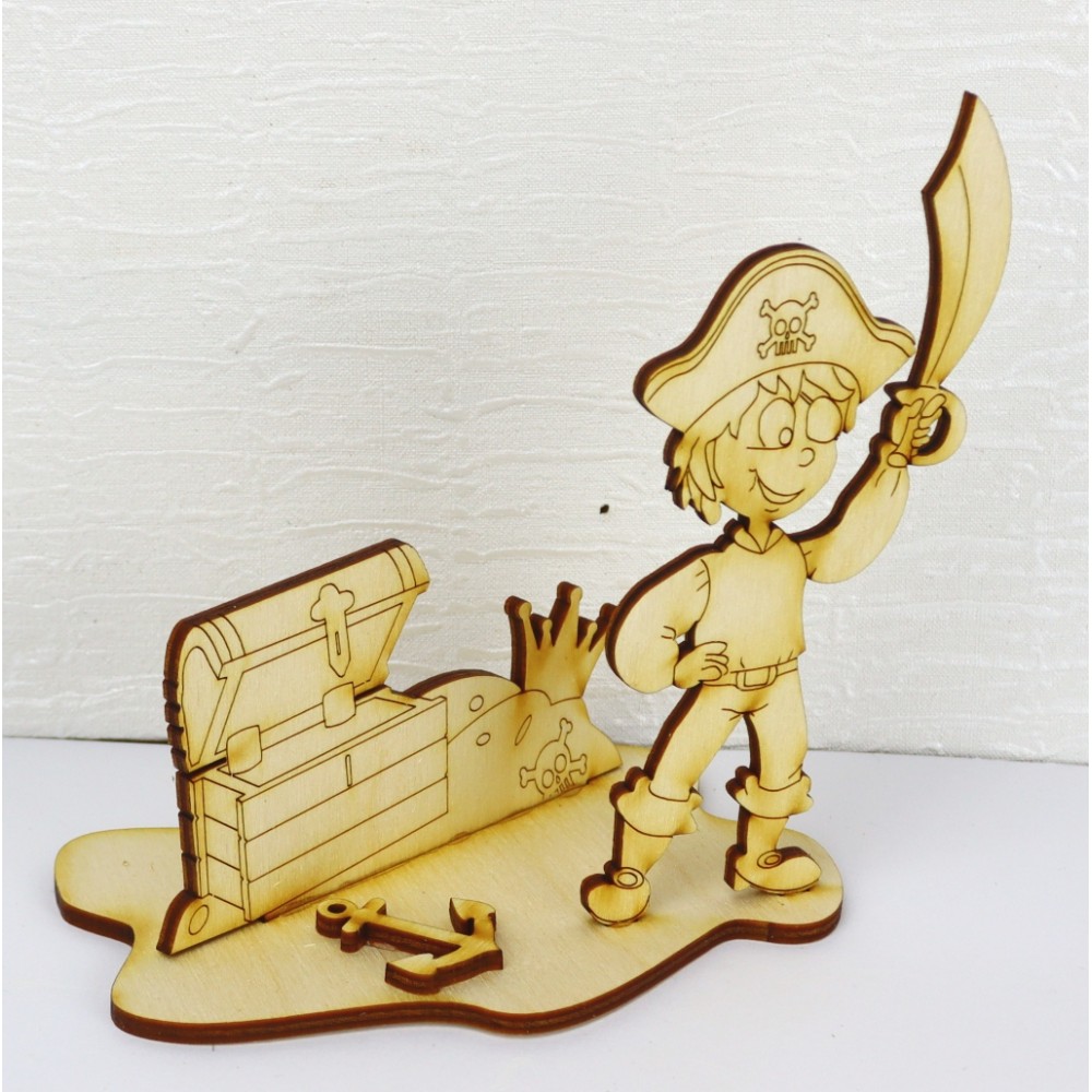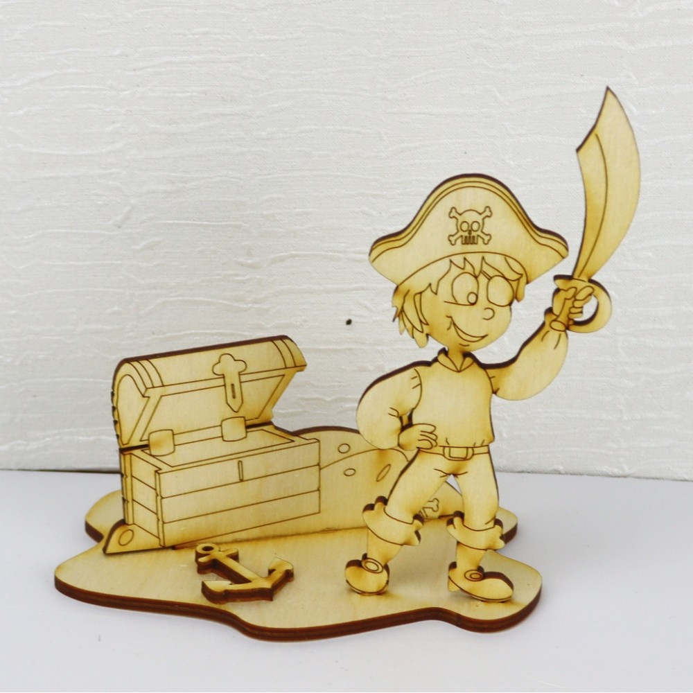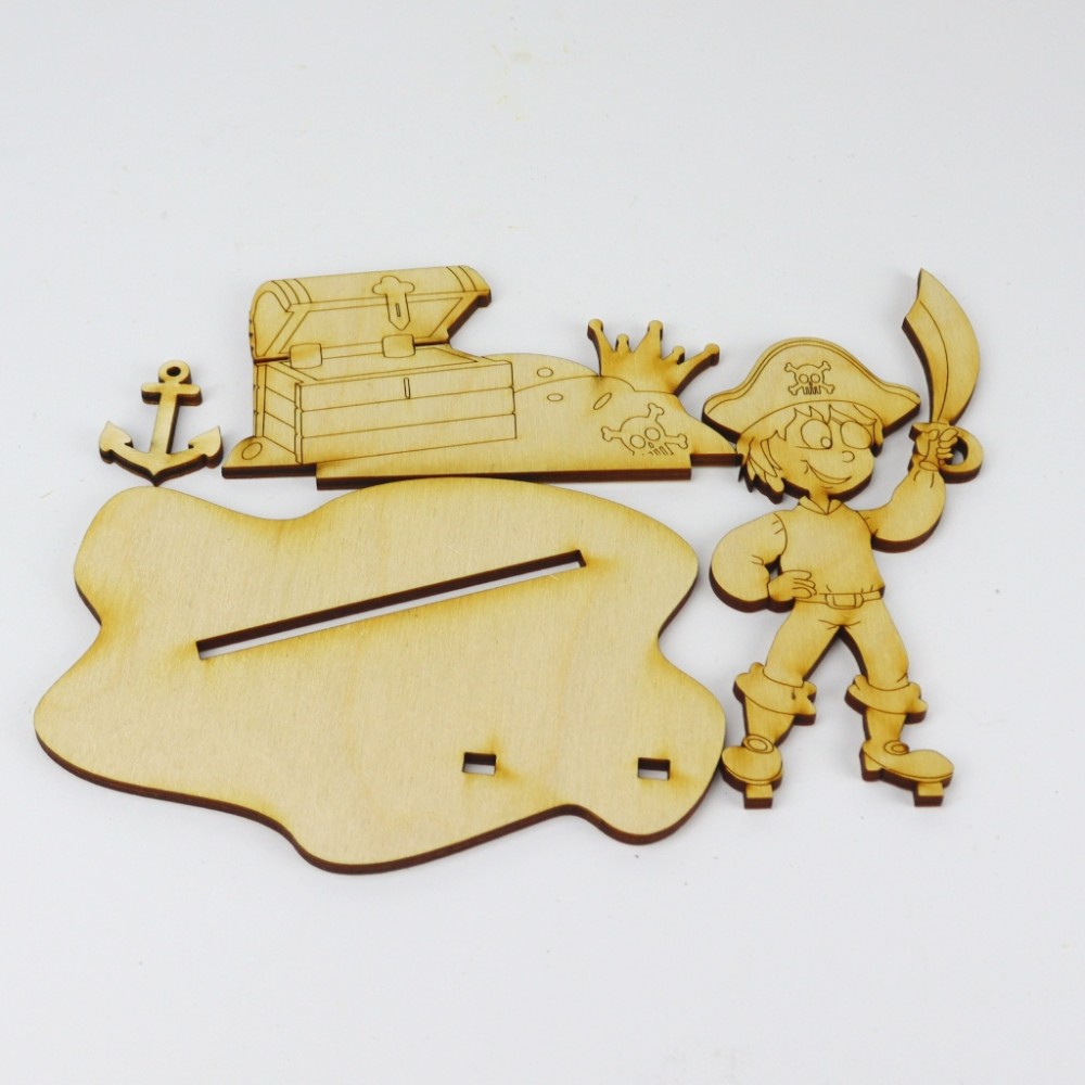 Das 4 teilige Bastelset besteht aus dem Piraten, seinem Schatzhaufen, einem Anker und der Unterplatte zum Hinstellen.